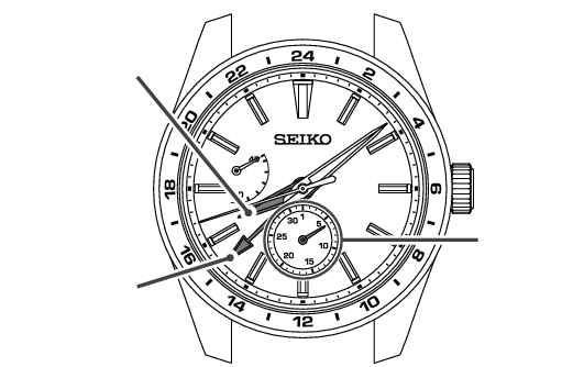 시계 바늘을 시계 방향으로 돌리는 경우, 용두를 화살표 방향으로 돌려서 24시간 시침과 분침을 설정하십시오.