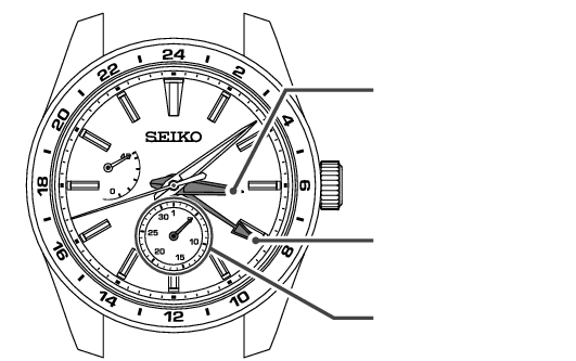 초침이 0초 위치에 있을 때 초침에서 클릭 소리가 들릴 때까지 용두를 당겨 빼냅니다. 초침이 움직임을 멈춥니다.