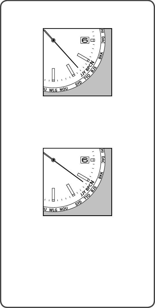 タイムゾーン選択モードに入り、現在設定されているタイムゾーンに秒針が移動します。