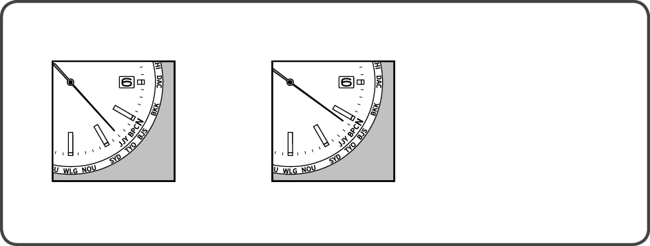 秒針の位置がタイムゾーンを表します。タイムゾーン表示と時差一覧を参考に合わせてください。