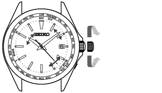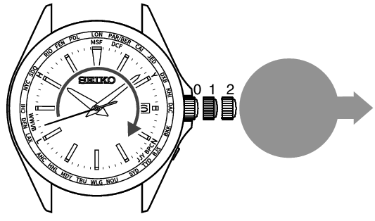 りゅうずを回すと秒針がとなりのタイムゾーンに移動し、連動して時分針も動きます。