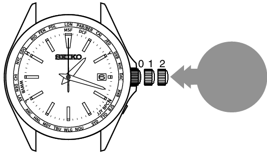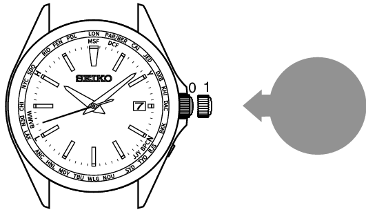 タイムゾーン選択のモードに入り、現在設定されているタイムゾーンに秒針が移動します。タイムゾーンを選択する(世界各地域の時刻を表示する)