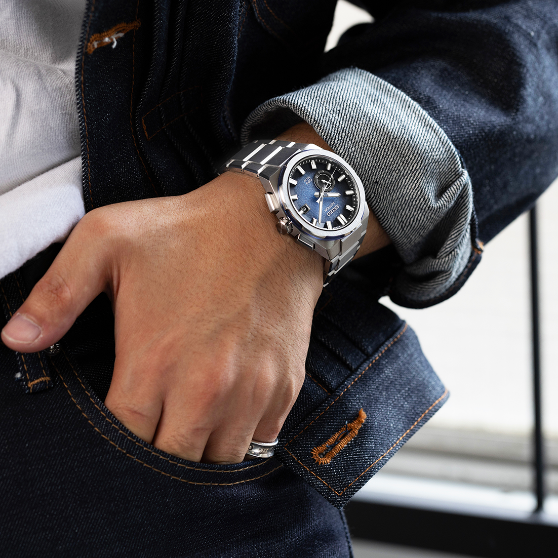 O mostrador exibe um novo padrão semelhante a finos grãos de areia, recordando-nos a superfície de um planeta. O seu tom profundo de azul é inspirado pela visão da Terra vista do céu. Os ponteiros de horas e minutos assumem um novo formato com secções centrais esqueletizadas. Em conjunto com os índices imponentes, contribuem para uma maior legibilidade.