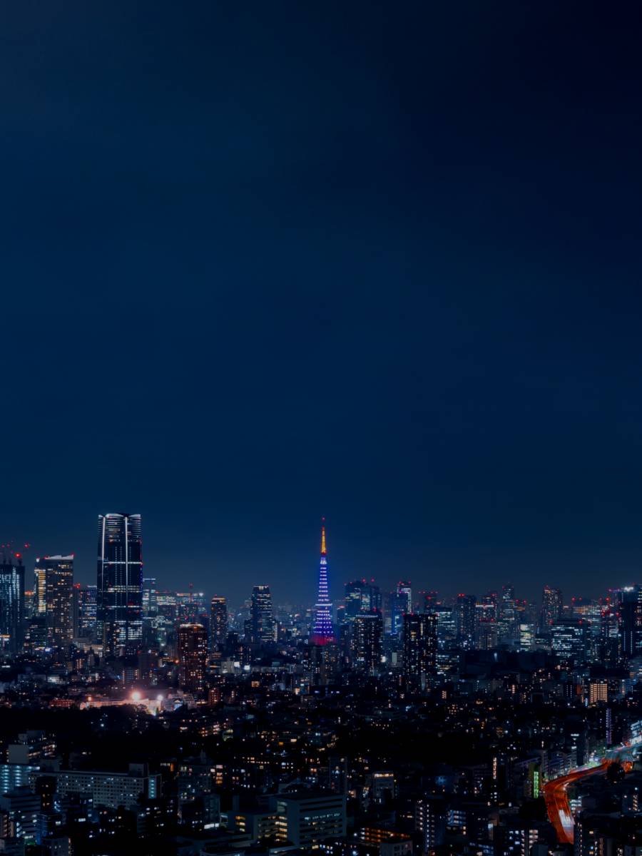 expressing the Tokyo scenery reflecting a clear blue sky on a