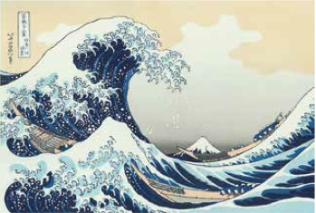 La série des ‘Trente-six vues du Monts Fuji’ de Katsushika Hokusai, connue dans le monde entier, est une icône de la culture japonaise. Peinte au 19°siècle à l’époque Edo, La Grande Vague de Kanagawa a valu à Hokusai sa renommée mondiale, grâce à sa composition d’un dynamisme saisissant et à