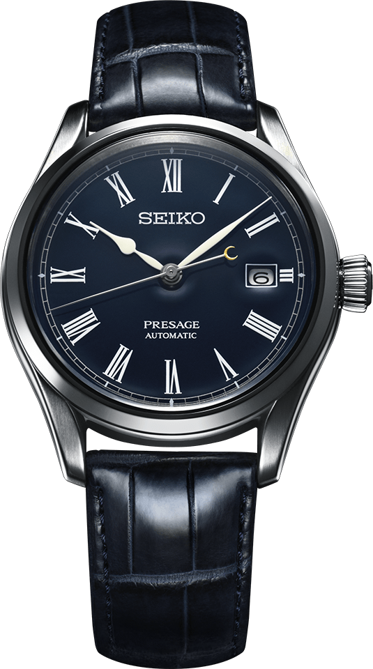 Cette nouvelle création Presage est inspirée par le ciel nocturne et la fascination du Japon pour la lune. Elle combine l’horlogerie mécanique de Seiko et le savoir-faire artisanal japonais dans le travail de l’émail, exprimé pour la première fois dans un cadran au bleu profond.