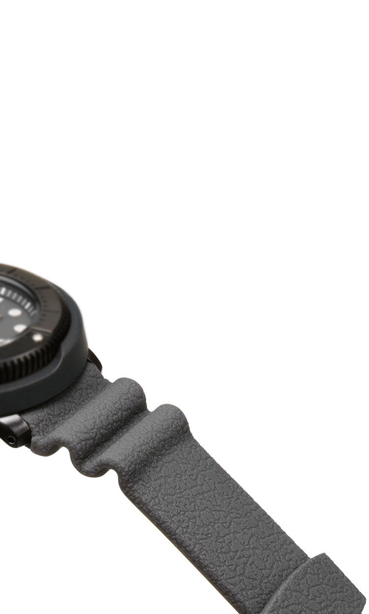 A leather pattern process is applied to a high-strength silicone accordion strap. It is designed to match equally well in town and the great outdoors.