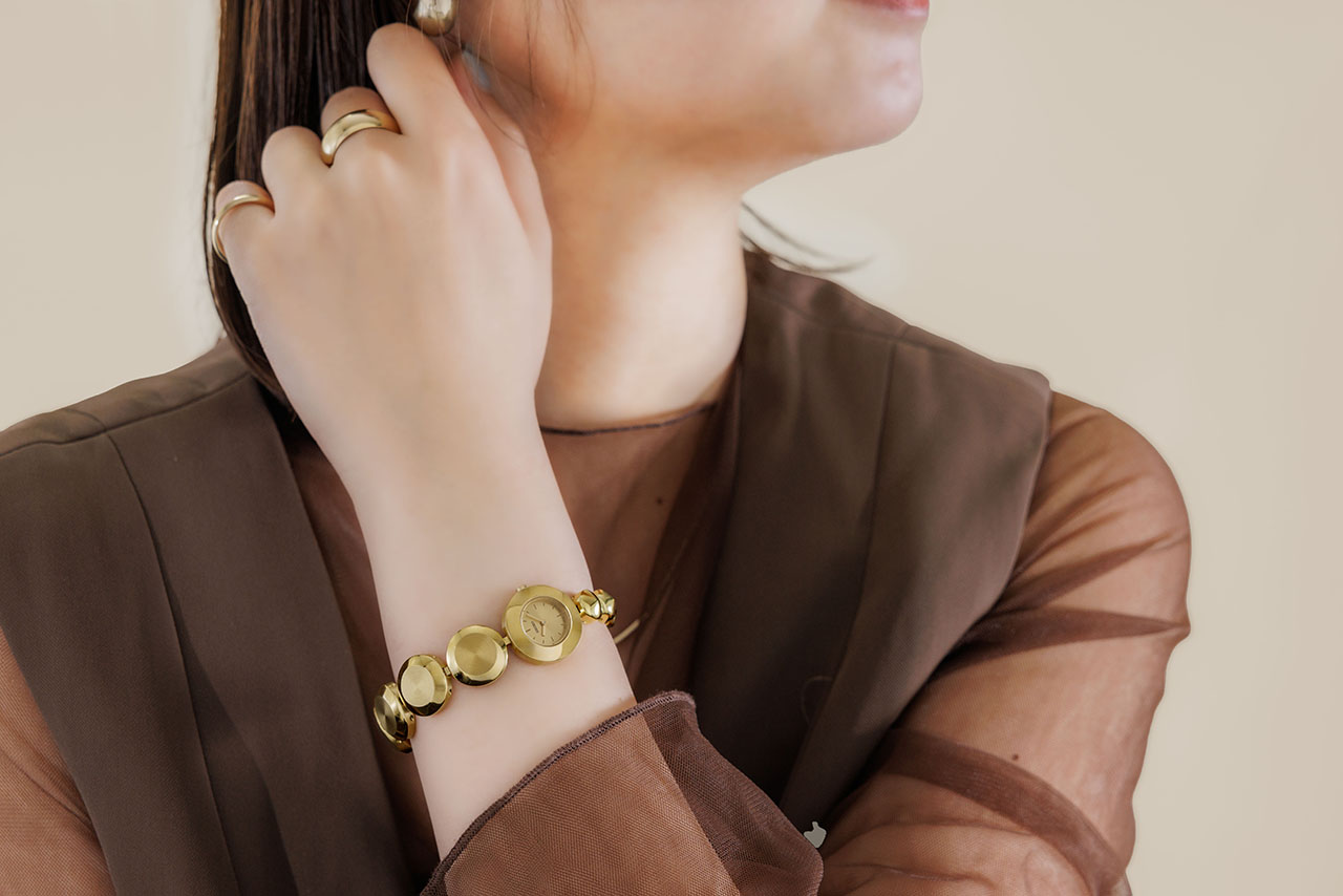 Ce modèle réinvente cette idée en modifiant la taille et la forme des maillons, tout en intégrant harmonieusement le boîtier au bracelet pour créer un design à porter comme un véritable bijou.
