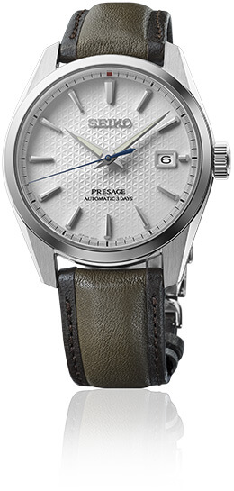 Following the design of the Laurel in nearly every detail, the first new creation joins the Presage Craftsmanship Series. Its pristine white enamel dial is the work of master craftsman Mitsuru Yokosawa and his team. Featuring a dial with a red “12” and classically styled blued hands, much like the Laurel, this creation is powered by Seiko’s high-performance Caliber 6R27. Crafted to stand the test of time, the lustrous white enamel dial displays the date at 6 o’clock and the power reserve at 9, while the case uses a recently updated design to emphasize the finely crafted dial and offer a slimmer look on the wrist.