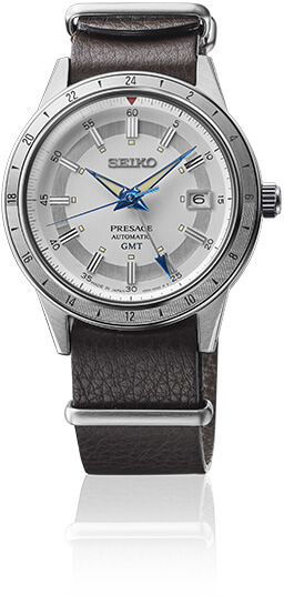 The last of the Presage creations is a Style60’s GMT powered by Caliber 4R34. Here, the blue hands, including the one for the GMT function, stand out against the dial while harmonizing with the classically styled case and bezel to provide excellent legibility and unimpeachable mid-century appearance. Thanks to an application of Lumibrite on the hour and minute hands, the time is always easy to read, day or night.