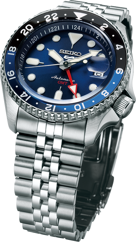 Dit is het beste 5 Sports-model voor internationale reizigers. Zonder afbreuk te doen aan het sportieve ontwerp heeft Seiko een GMT-functie toegevoegd om een tweede tijdzone te kunnen weergeven. Door gebruik te maken van de draaibare bezel is het zelfs mogelijk om drie tijdzones in één oogopslag te volgen.