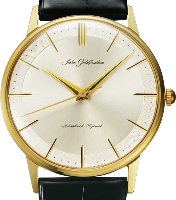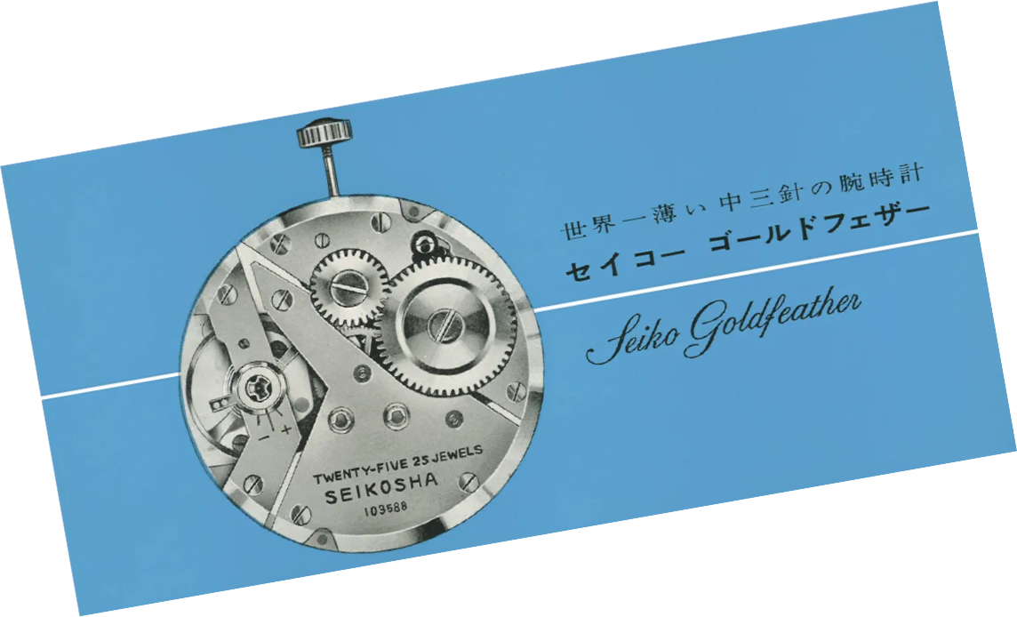In de jaren 1950 streefde Seiko zowel ‘hoge precisie’ als ‘slankheid’ na. In 1960 introduceerde Seiko de Seiko Goldfeather. Een horloge dat licht, nauwkeurig en comfortabel om te dragen was. En zeer aantrekkelijk! Het maakte gebruik van het kaliber 60, dat slechts 2,95 mm dik was. Waardoor het op dat moment het dunste driewijzers-uurwerk ter wereld was.