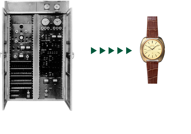 De fenomenaal nauwkeurige quartz-klok die in 1959 werd geleverd aan omroepstations had de maat van een grote boekenkast. Het leek onmogelijk om het quartz-mechanisme te verkleinen, zodat het in een polshorloge zou passen. Maar na jaren van doorzetten slaagde Seiko erin om het uurwerk te verkleinen tot 1/300.000ste van de oorspronkelijke grootte. Dankzij die opmerkelijke doorbraak kon het tijdperk van quartz-horloges in 1970 echt beginnen.