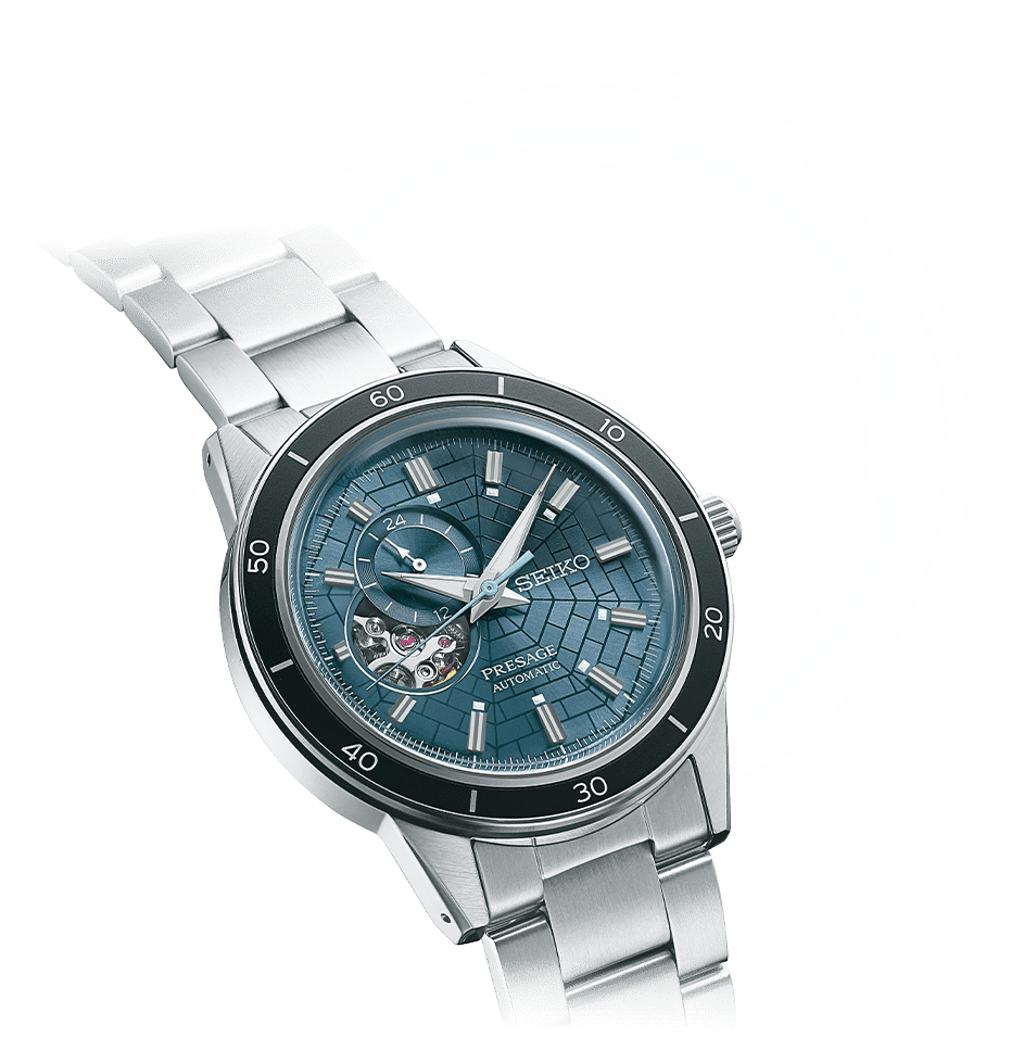 A criação do Presage apresenta o mesmo padrão de mostrador inspirado em paralelepípedos das ruas de Ginza e o ponteiro de segundos na cor Komparu, porém o relógio possui o aspecto distinto da série de design "Style60's" recentemente lançada, inspirada no Seiko Crown Chronograph de 1964. O vidro em forma de caixa, os ponteiros nítidos e os indicadores facetados são herança direta do Crown Chronograph e criam uma sensação retrô que combina perfeitamente com o modelo clássico do mostrador. A abertura na posição das 9 horas permite ao usuário observar e apreciar o funcionamento do mecanismo e o submostrador de 24 horas oferece uma maneira diferente e útil de ver as horas.