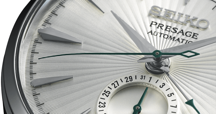 Un modèle au cadran argenté inspiré d'un cocktail, le Martini. Les aiguilles des secondes, du calendrier et de la réserve de marche verts représentent les olives que l'on retrouve dans les Martinis.