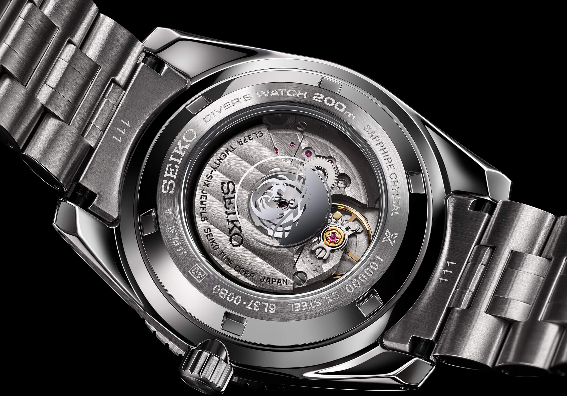 Zum ersten Mal bei einer Taucheruhr von Seiko verfügen die neuen Marinemaster Kreationen über einen Glasboden, der den Blick auf das fein gearbeitete, mechanische Hochleistungswerk freigibt. Durch die Überarbeitung der Gehäusestruktur und die Verwendung des schlanken Kalibers 6L37 hat Seiko seine derzeit dünnste mechanische Taucheruhr (12,3 mm) geschaffen und gleichzeitig den Blick auf das Uhrwerk freigegeben.