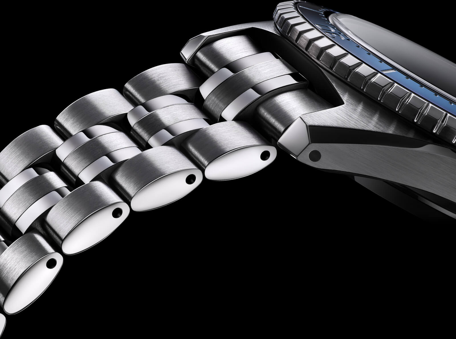 Tragekomfort und Bequemlichkeit stehen bei der neuen Marinemaster an erster Stelle. Das gänzlich neue Armband verfügt über ellipsenförmige Glieder mit hochglanzpolierten, doppelt gewölbten Oberflächen.