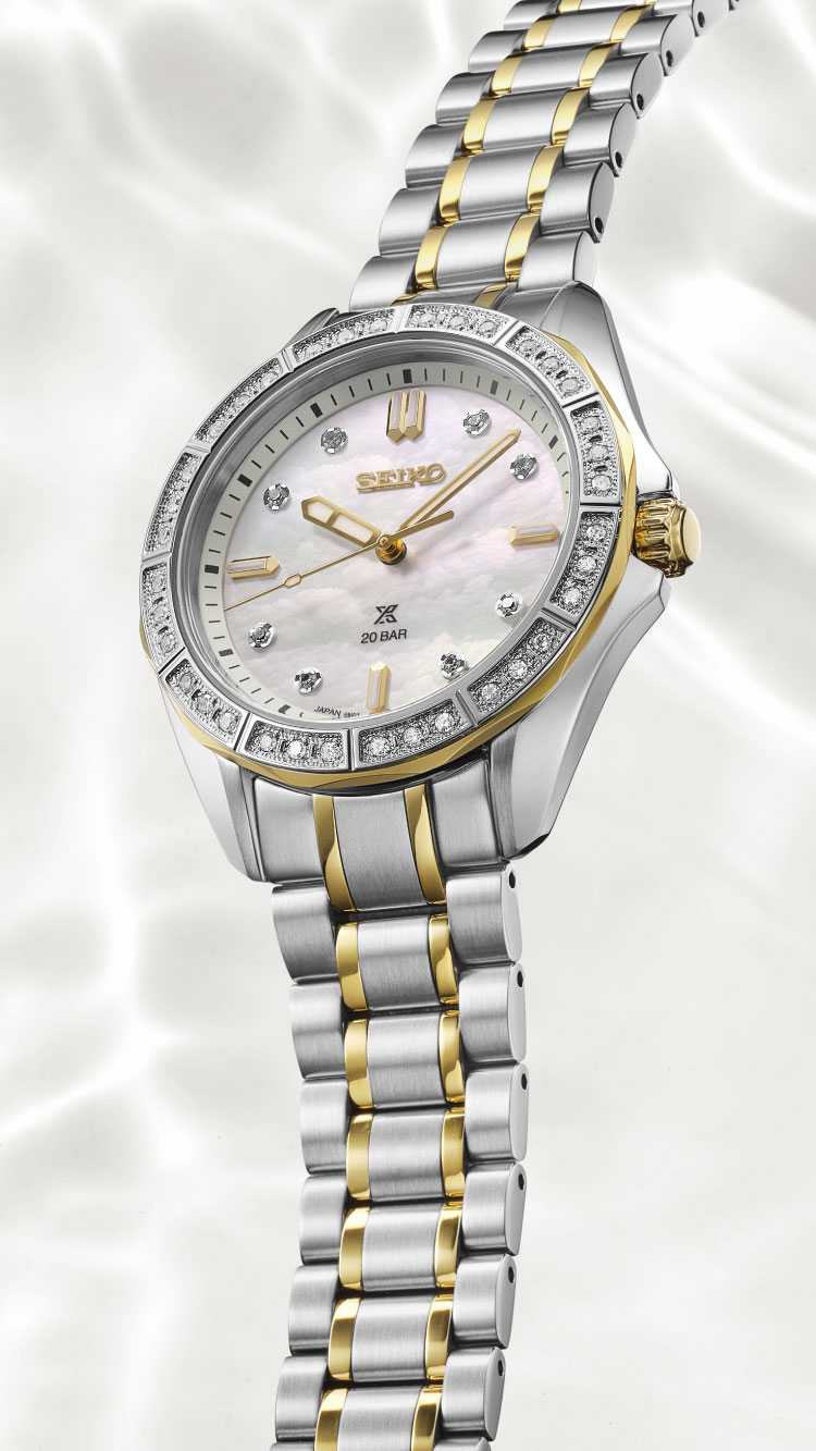 Das Zifferblatt kombiniert acht diamantbesetzte Indexe mit schimmerndem Perlmutt und verleiht der Uhr einen luxuriösen Charakter, der sich ideal für festliche Anlässe eignet. Gleichzeitig gewährleisten die markante Zeigerform und der Einsatz von LumiBrite beste Ablesbarkeit – ganz im Sinne einer modernen Sportuhr.