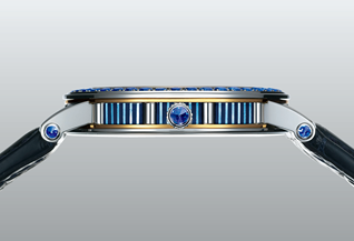 La magnifica cassa in platino di diametro 43mm è ornata con quarantatre zaffiri blu, disposti in armonia con il quadrante in una stupenda gradazione di colore. Fra le barrette ai lati della cassa vi sono strisce sottili in madreperla che formano un’intricata finitura.