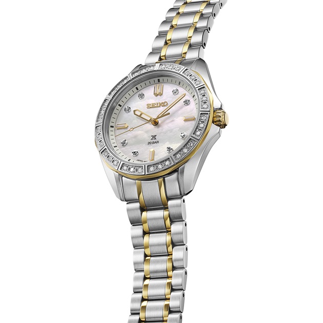 Inoltre, il quadrante è realizzato in madreperla e impreziosito da otto indici in diamante, offrendo un’eleganza perfetta per le occasioni formali. Allo stesso tempo, la forma delle lancette e l’uso del Lumibrite garantiscono un’eccellente leggibilità in qualsiasi ambiente, come ci si aspetta da un moderno orologio sportivo.