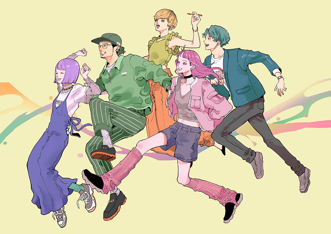NAKAKI PANTZ: Ho creato cinque personaggi colorati — in viola, verde, giallo, blu e rosa — facendo attenzione a non farli sembrare una squadra uniforme. Hanno età e generi leggermente diversi, ma si muovono tutti nella stessa direzione. Credo sia un’immagine luminosa e positiva.