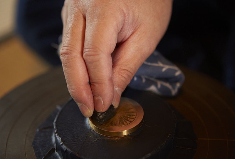 The materials used to craft watch dials are metallic, and the first step in the lacquering process is to polish dial-shaped brass material. As lacquer cannot adhere to smooth metallic surfaces, the polishing process serves to roughen surfaces and allow the Urushi to bond. The material used to achieve this effect is charcoal. While there are several different types of charcoal available for use in this process, the variety used in Presage dials is called Suruga charcoal (after an area in Shizuoka prefecture) and is employed for its fine grain and optimum hardness.