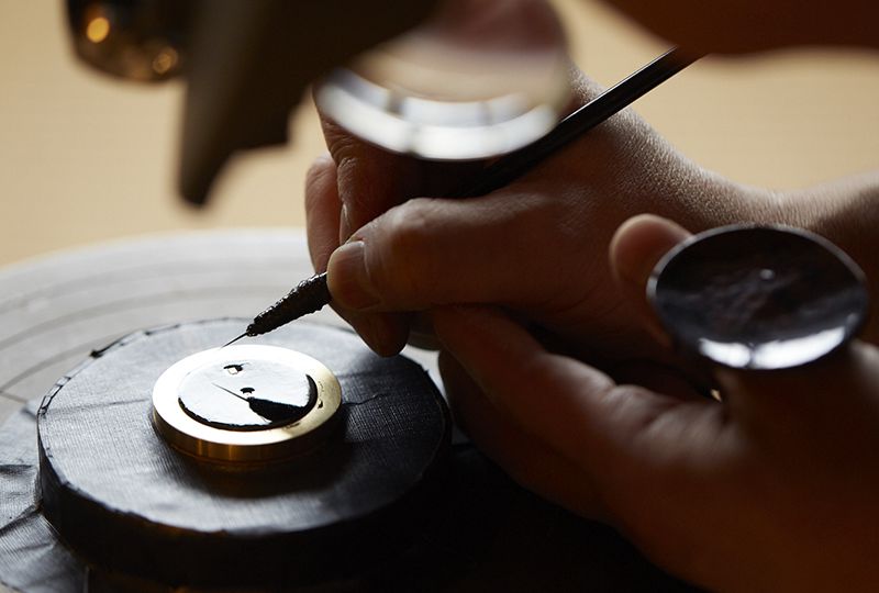 By this stage, the dial has been thoroughly coated in Urushi and displays the characteristic deep-black color. The finished polishing step is carried out using a compound selected specifically to be used with Urushi, and is done to further enhance the lacquer’s color and wipe away any fine scratches. Finally, an extremely thin layer of Suri Urushi is applied to fill in any minute scratches or pinholes unable to be removed in the former process.