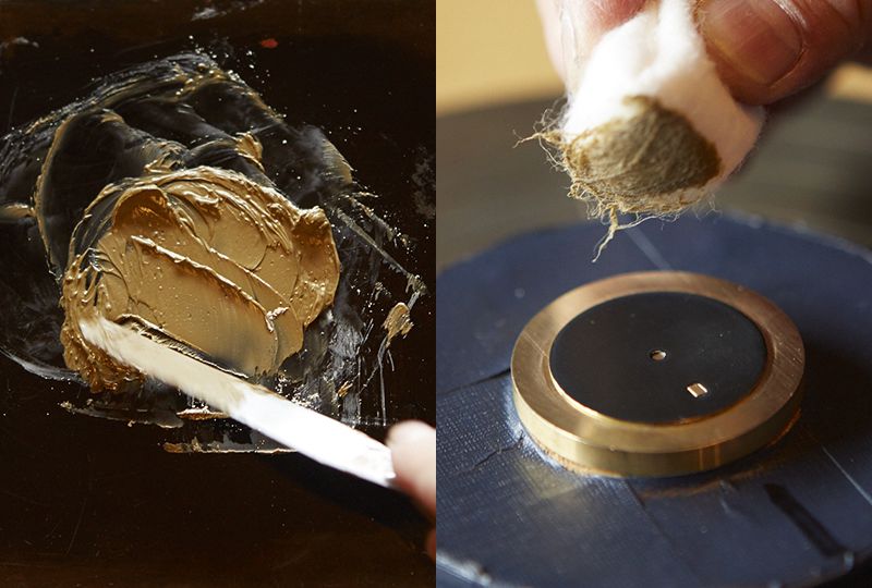 Once the top coat has been applied, the dial is polished first with Suruga charcoal and then with both rough and fine grits of whetstone powder in a multi-step process until the desired texture is achieved. This process allows for an even greater level of smoothness. Next, a layer of Suri Urushi, a lacquer which turns clear when dry, is applied and the dial is readied for the next step.