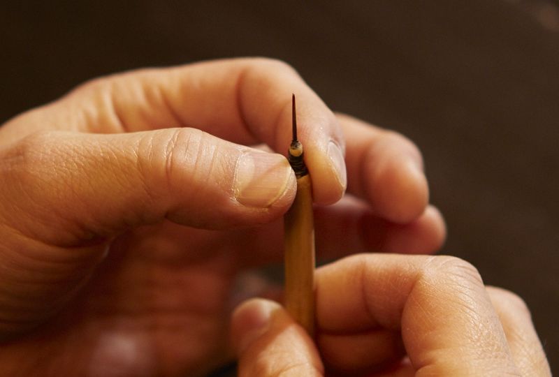 The tools used in Maki-e are extremely rare, with only a handful currently in existence. Often, the tools lacquer artists use in their craft, such as brushes and thin Funzutsu tubes, are made by the craftsmen themselves. Mr. Tamura’s makes his brushes from bamboo grass from the mountains of Kanazawa, fitting them with brush heads and using them as an extension of his hand. Because the brushes are handmade, not all of them satisfy Mr. Tamura’s strict standards. Out of twenty brushes, he chooses only two or three to work with. He also uses spatulas made with human hair bound with animal glue, a tool he values for its particular smoothness.