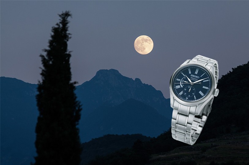 Der japanische Uhrenhersteller Seiko ehrt den Mond immer wieder durch besondere Kreationen. Bei der SPB091J1 symbolisiert ein Zifferblatt aus blauer Emaille den nachtblauen Himmel. Die Mondsichel am Ende des Sekundenzeigers stellt dabei den über den Nachthimmel gleitenden Himmelskörper dar.