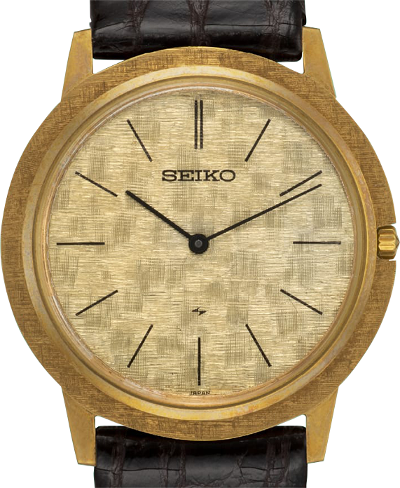 Die erste Quarz-Armbanduhr der Welt. Dieses Modell hatte ein handgraviertes Muster und wurde in einem glänzenden 18K-Gehäuse geliefert. Neben ihrer phänomenalen Ganggenauigkeit erregte sie auch wegen ihres Preises von 450.000 JPY Aufmerksamkeit. Sie kostete mehr als viele beliebte Autos zu jener Zeit.