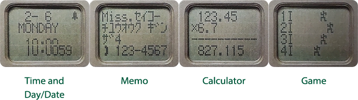 Neben der Anzeige der Uhrzeit verfügt dieses Modell über eine Taschenrechnerfunktion, die durch Drücken von Knöpfen an der Seite des Gehäuses bedient wurde. Mit der Uhr wurde ein spezieller Stift geliefert, mit dem die kleinen Tasten auf dem Tastenfeld gedrückt werden konnten.