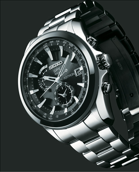 Die erste GPS Solaruhr der Welt, ein Modell, das mit einem Knopfdruck überall und jederzeit die Uhrzeit in jeder Weltzeitzone anzeigen kann. Die Astron GPS Solar empfängt genaue Zeitinformationen von den in den GPS-Satelliten installierten Atomuhren und benötigt dabei nur die Energie des Lichts.