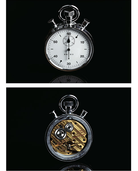 従来の機械式ストップウオッチは、複数個で計測した場合、誤差が生じていました。1962年にセイコーは、機械式時計の心臓部であるてんぷに「ハートカム」というハート型の部品を取り付け、スタート・ストップ機能を大きく革新し、計測の誤差を防ぐストップウオッチを完成させました。