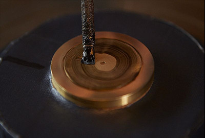Nach zwei Wochen und dreimaligem Auftragen der Grundierung und Polieren ist das Zifferblatt bereit für seine nächste Zwischenbeschichtung. Der Zweck der Zwischenbeschichtung ist es, dem Zifferblatt eine dickere Beschichtung zu verschaffen, um so die einzigartige tiefschwarze Urushi-Farbe zum Vorschein zu bringen. Das Urushi, welches in der Grundierung, der Zwischenbeschichtung und im Decklack verwendet wird, stammt aus Japan. Obwohl es sowohl in Übersee als auch in Japan hergestelltes Urushi gibt, weist Urushi aus Japan eine höhere Qualität bei den Beschichtungseigenschaften auf, was zu einer einzigartigen Tiefe beim Endprodukt führt. Dieser Schritt ist entscheidend bei der Definition des fertiggestellten Bildes des Produkts.