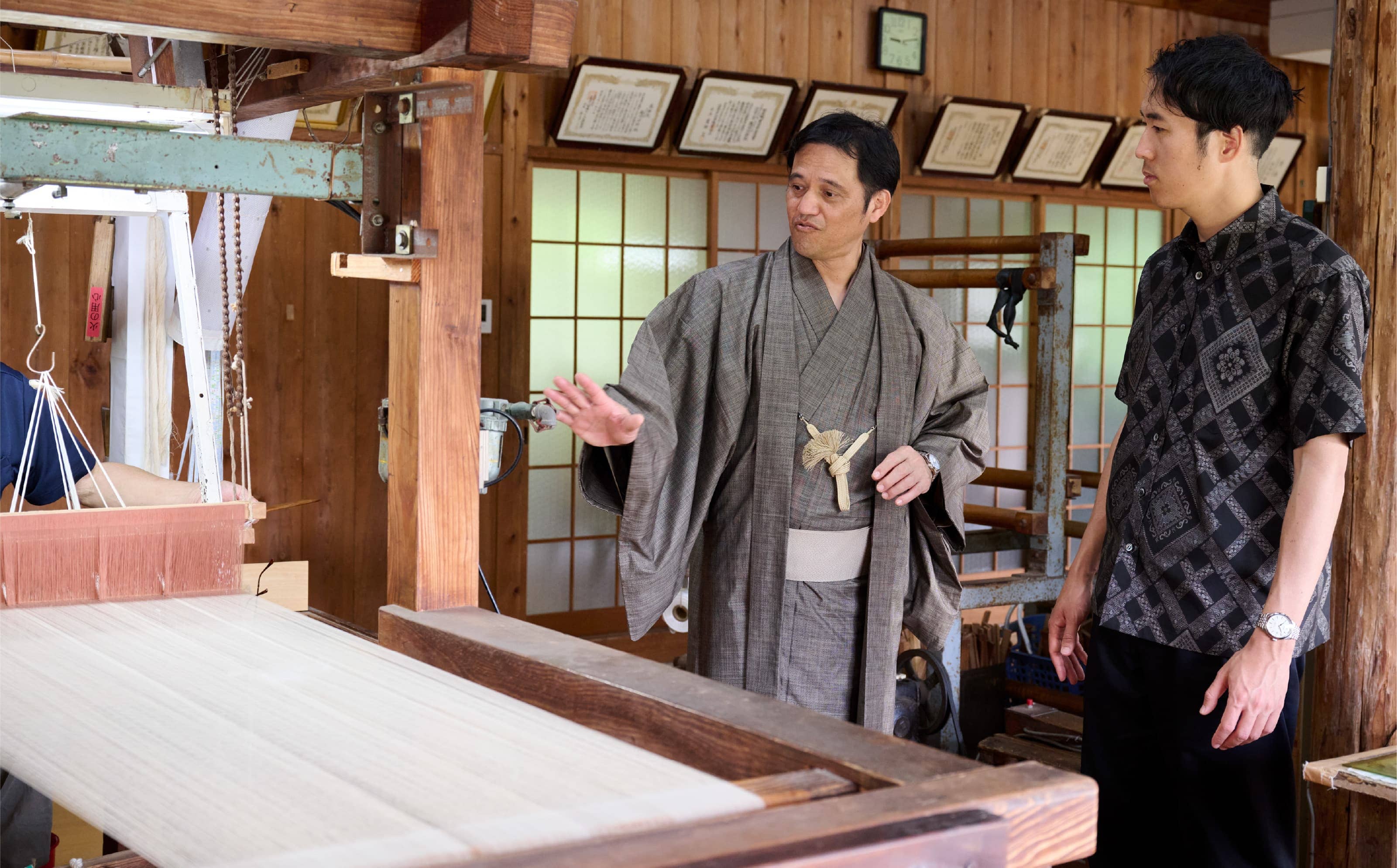 Et møde mellem Tokuharu Koshima, repræsentant for Oshima Tsumugimura, og Takuya Matsumoto, designer hos Seiko Watch Corporation