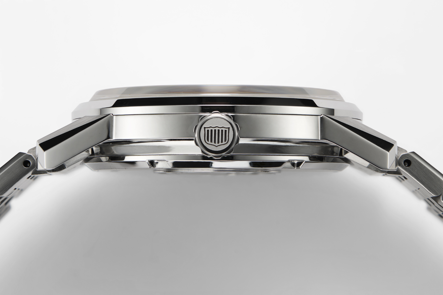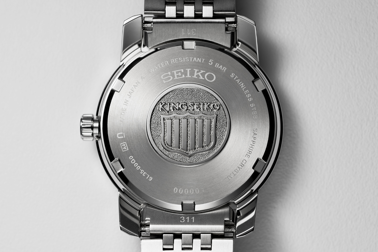 Aunque se basa en el diseño del brazalete utilizado en los King Seiko de la década de 1970, se ha logrado un aspecto más voluminoso mediante el tallado de acero inoxidable macizo, y los eslabones del brazalete presentan planos planos que combinan con las asas multifacéticas, con el objetivo de armonizar el diseño del reloj de pulsera en su conjunto.