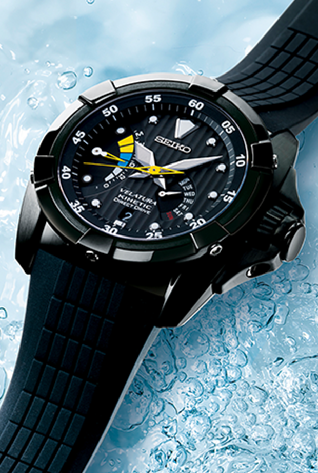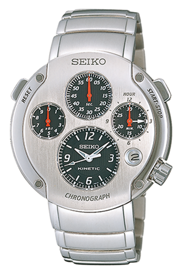 Este fue el primer cronógrafo Kinetic, que introdujo un diseño radical de múltiples esferas que separaba completamente la esfera de visualización de la hora de las esferas del cronómetro. Kinetic era un mecanismo patentado de Seiko que utilizaba el movimiento del reloj para generar automáticamente electricidad para accionar el mecanismo de cuarzo. Su sensación de alta tecnología encajaba perfectamente con el diseño vanguardista y futurista, que se convirtió en un éxito entre los aficionados a los relojes.