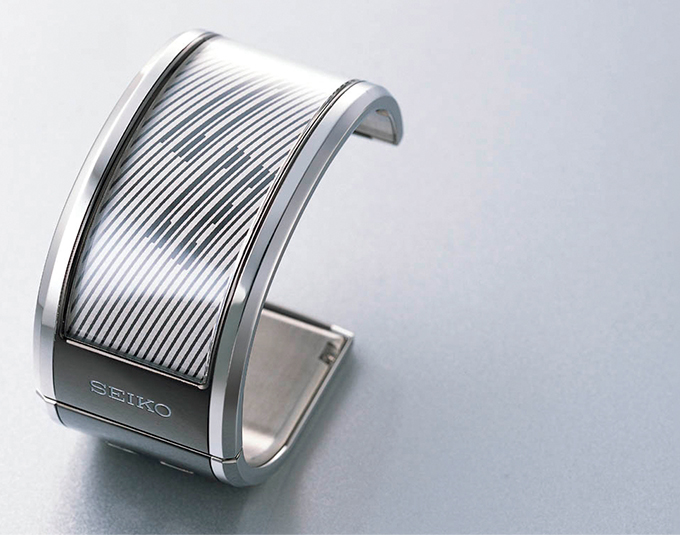 La gran pantalla curvada aprovechaba la tecnología de tinta electrónica más avanzada del momento. Seiko fue una de las primeras empresas en lanzar un novedoso reloj de pulsera con forma de brazalete que ofrecía un contraste más claro y un ángulo de visión más amplio que las pantallas LCD convencionales, así como la libertad de doblar la pantalla.
