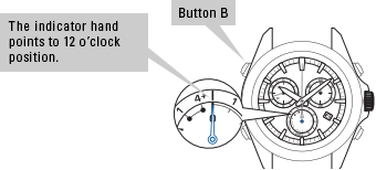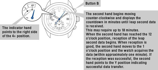 L’aguille des secondes commence à bouger en sens inverse et indique le compte à rebours en minutes, jusqu’à réception de la donnée de seconde intercalaire. Cela peut prendre jusqu’à 18 minutes. Quand l’aiguille des secondes est à 12 heures, le processus de réception de la donnée de seconde intercalaire commence. Quand la réception est bonne, l’aiguille des seconde atteint la position 1 heure et la montre intègre la donnée (en approximativement 1 minute). Si la réception est réussie, l’aiguille des secondes pointe la position Y en signe de réussite de transfert de donnée.