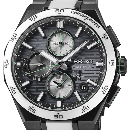 Le cadran présente un nouveau motif horizontal avec des lignes intermittentes, évoquant le déplacement de la lumière à grande vitesse. Des touches vert clair sont appliquées à différents éléments, créant un design résolument sportif.