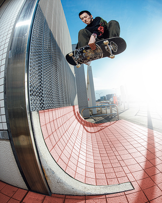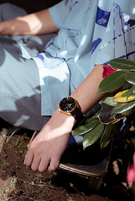 The off-white dial resembles the urethane material of a skateboard wheel, and the calf belt resembles the wood-grained skateboard deck. The highlight of the design is the dial center, made in the image of a skateboard’s bearing.