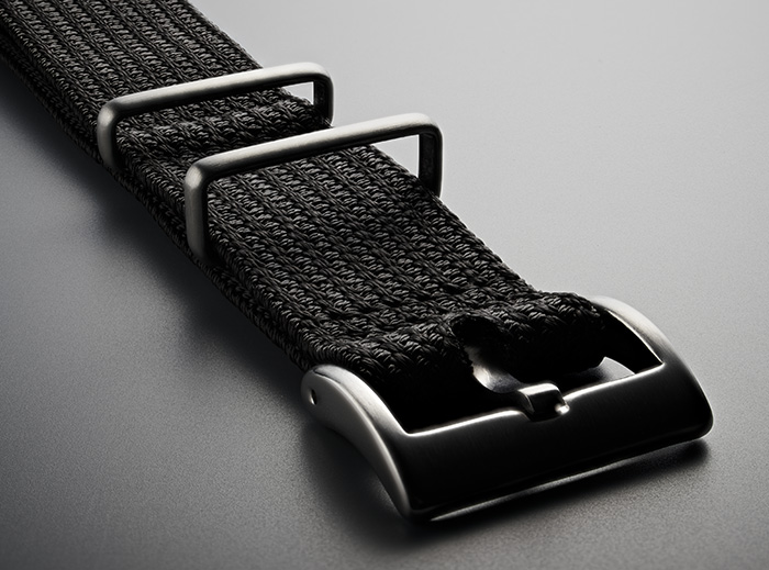 The metal parts of the fabric strap's construction have a strong and solid form giving a dignified diver's watch feel to the contemporary creations.