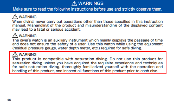 Namun, nanti dalam buklet instruksi, ada indikasi peringatan yang benar yang menyatakan, "Jangan pernah menggunakan produk, bagaimanapun, dalam penyelaman saturasi" dalam "Pencegahan untuk penyelaman" pada P. 56. [P. 46]