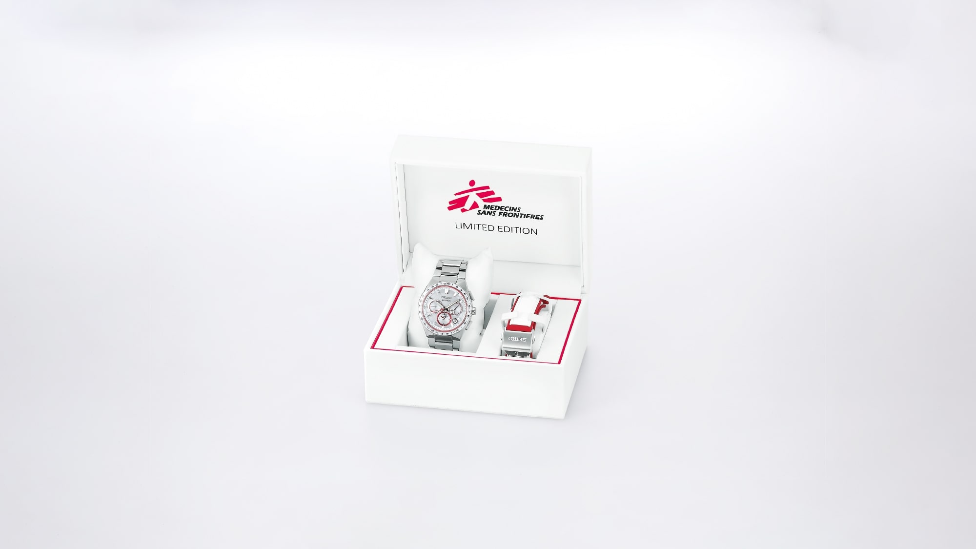 Untuk memperingati kolaborasi ini, jam tangan ini disajikan dalam kotak khusus berwarna merah dan putih yang terinspirasi dari Médecins Sans Frontières.