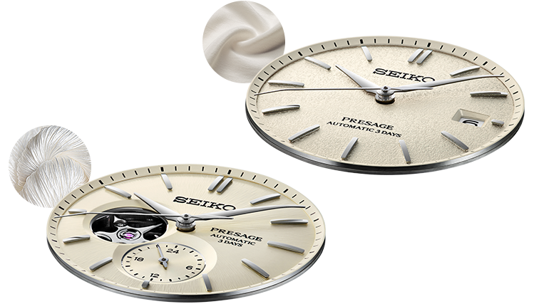 Inti dari seri ini adalah pelat bertekstur kaya dan melengkung yang mengekspresikan rasa lembut dan lentur dari tekstil alami. Seri ini menampilkan dua konfigurasi pelat yang berbeda dan serangkaian fungsi. Pelat pada kreasi tiga jarum dengan tanggal terinspirasi dari kain sutra yang berkilau, sedangkan dua jam tangan open-heart mengekspresikan tekstur benang sutra mentah melalui pola radial. Dengan kelengkungan dan pola bertekstur rumit, pelat menangkap dan memantulkan cahaya sekitar untuk menciptakan rasa kedalaman dan keindahan yang meningkat. Bagian atas indeks melengkung untuk menyesuaikan dengan bentuk bulat pelat, dan jarum menit serta detik sedikit membungkuk menuju penanda.
