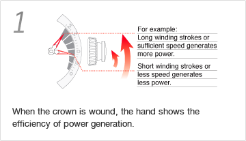As in all existing Kinetic calibers, the wearer automatically generates electrical energy by her/his wrist movement. With Kinetic Direct Drive, however, the wearer can also generate energy by winding the crown.