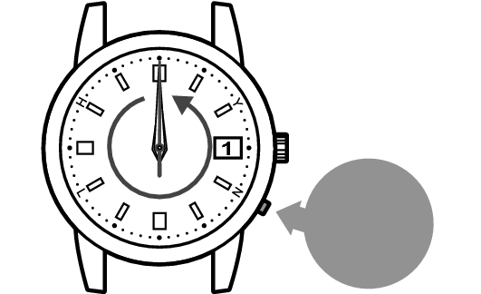 当秒针位于 13 秒(UTC +13 小时)位置时,按住该按钮将其移动到 49 秒(UTC -11 小时)位置。
