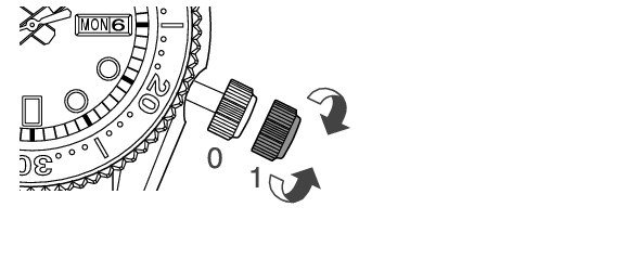 Rode a coroa no sentido anti-horário para ajustar a data para “1”, e depois volte a empurrar a coroa para a posição normal.
