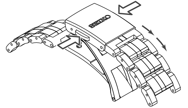 1. Betätigen Sie die Drücker auf beiden Seiten des Verschlusses und ziehen Sie die Schließe nach oben.
